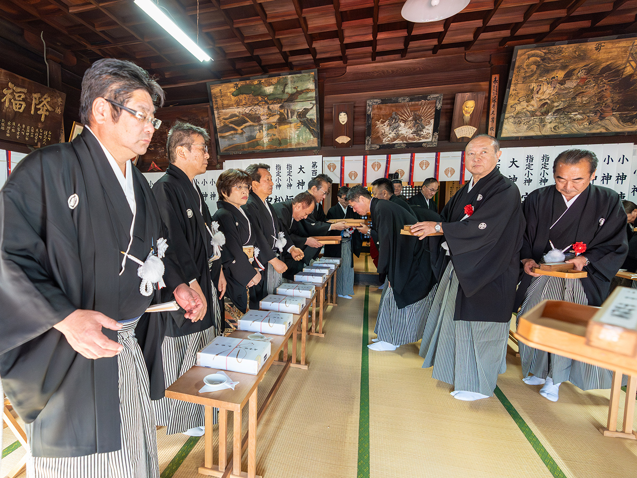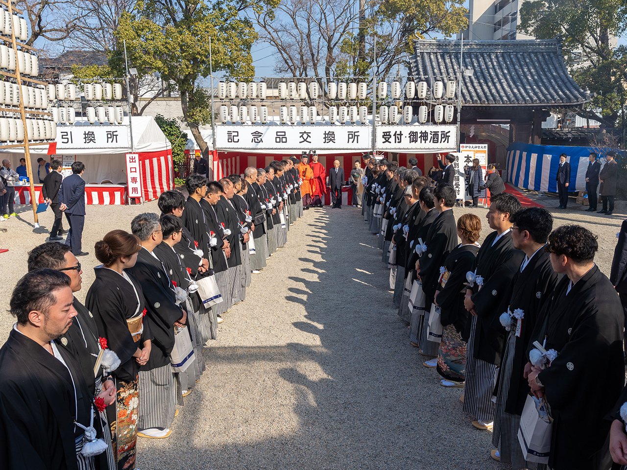 午前五時より祭行される大変寒い中での伊勢会祭、午前八時の国旗掲揚そして境内社恵比須社にての商売繁盛を祈念する恵比須祭、特殊大祭とお祭が祭行され、午後二時の通渡しの神事にて、当代より次代に通が渡り、いわゆるバトンタッチが行われ、その時より次代百四代伊勢会の皆様が当代として御奉仕される事となります。